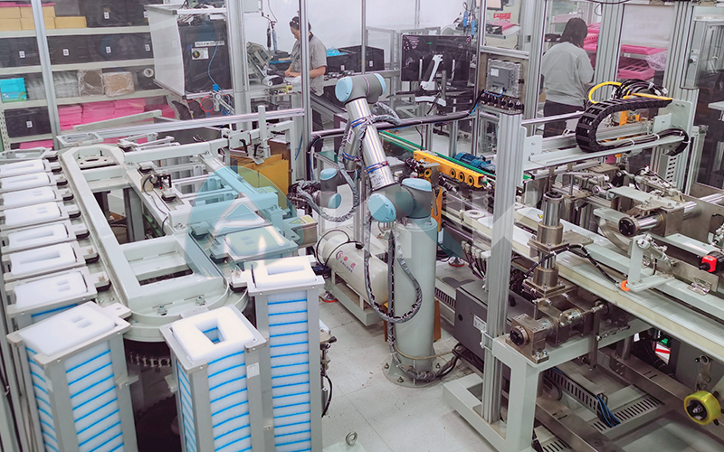 自动开箱→说明书/配件/产品等自动装箱→自动封箱→自动检测→自动贴标